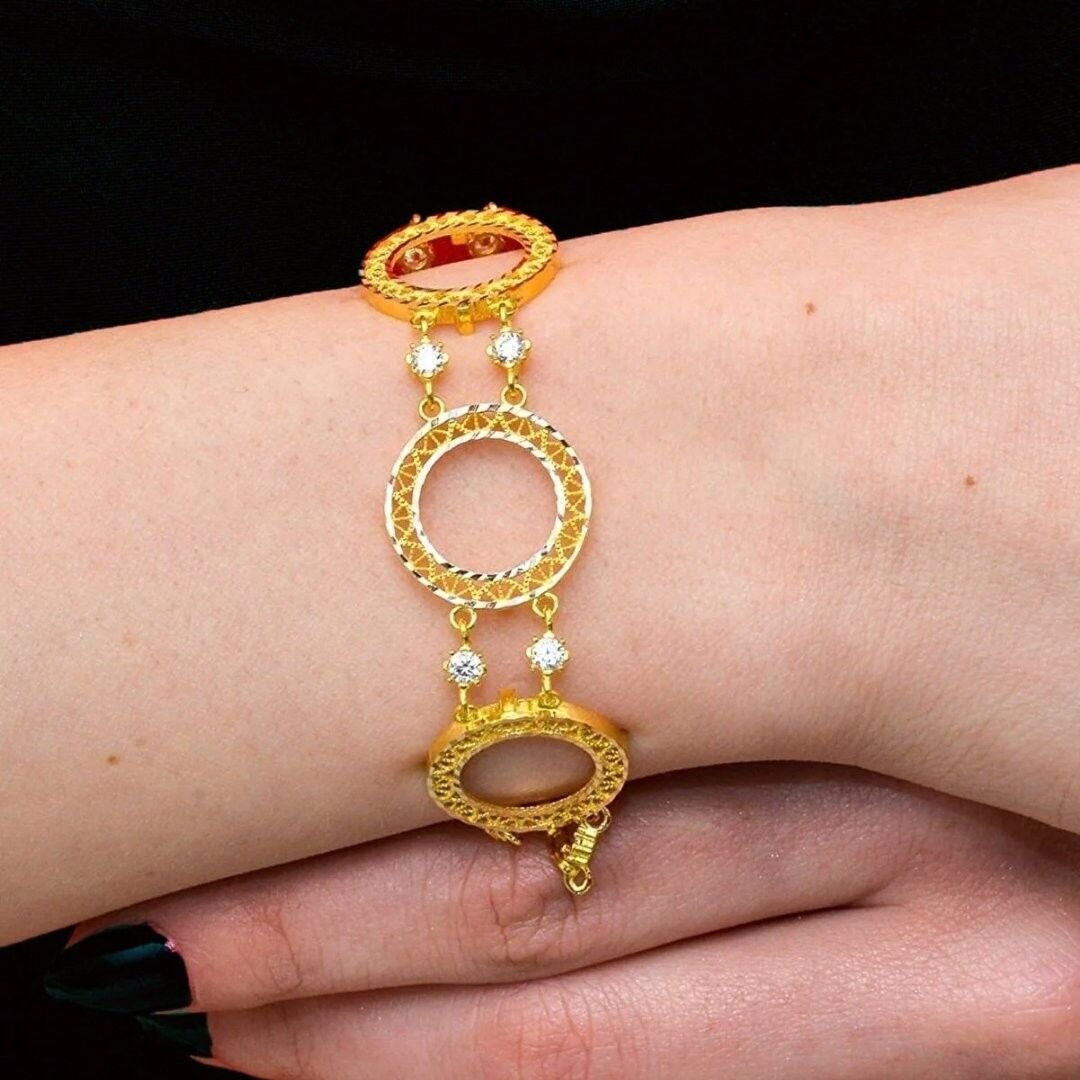 Evla Kuyumculuk’un özel tasarımı olan 14 Ayar Altın 3 Çerçeveli Çeyrekli Bileklik, göz alıcı bir takı parçasıdır. Bu bileklik, yüksek kaliteli 14 ayar altından üretilmiş olup, özgün tasarımıyla dikkat çekmektedir. Bilekliğin en belirgin özelliği, 8,86 gram ağırlığındaki üç adet altın çeyreksiz çerçeveleridir. Altın çeyrekler, bilekliğe değerli bir detay katar ve çekiciliğini vurgular. Üç çerçeve ise bilekliğe modern ve şık bir görünüm kazandırır.
