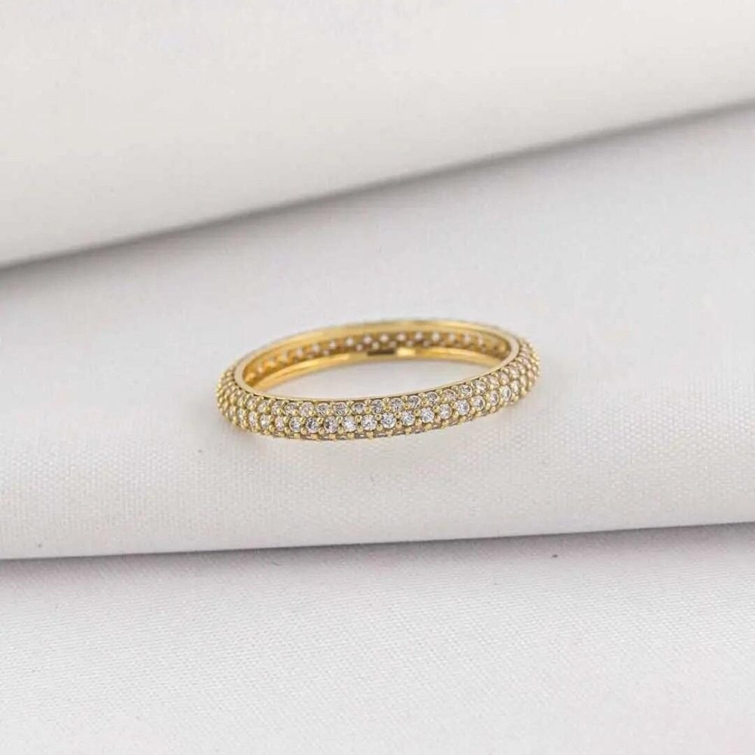 Yüzüğün tasarımı, zarif ve modern bir tarza sahiptir. 14 ayar altından özenle üretilen yüzük, üç sıra tamtur taşıyla süslenmiştir. Bu taşlar, yüzüğe benzersiz bir ışıltı ve zarafet katarken, parmakta göz alıcı bir şekilde durur. Her bir detayıyla özenle işlenen yüzük, tarzınıza sofistike bir dokunuş sağlar.