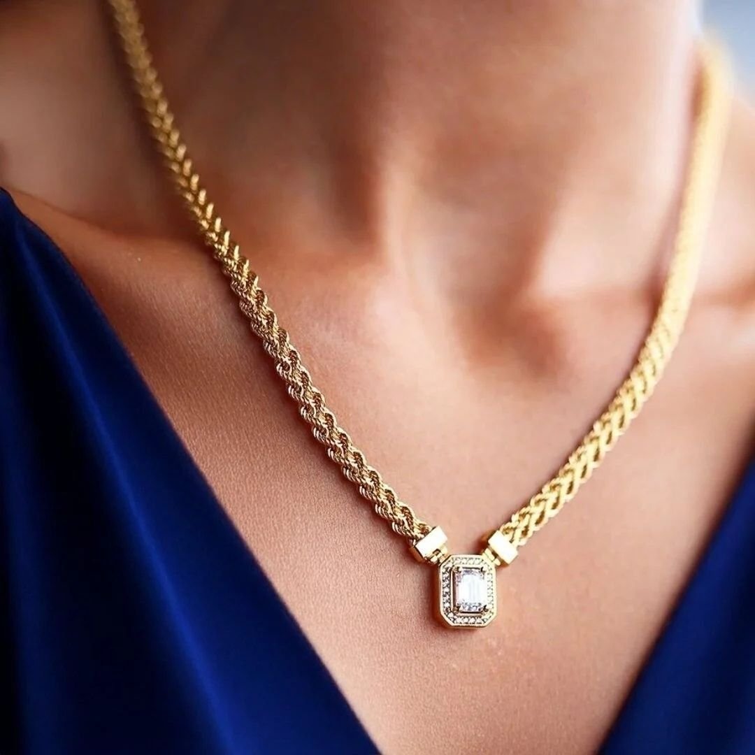 Baget Taş Detayı: Baget taşlarla bezeli tasarım, kolyeye modern ve sofistike bir hava katmaktadır.