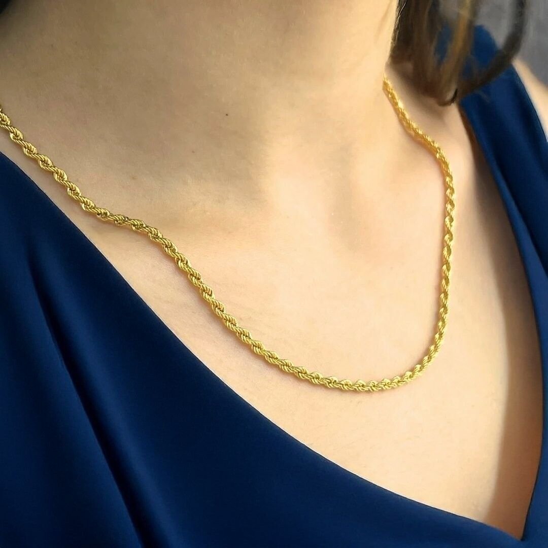 Bu 14 ayar altın halat burgu zincir, zarif ve şık bir görünüm sunar. 50 cm uzunluğuyla rahat kullanım sağlayan bu zincir, farklı kıyafetlerle uyum gösterir.