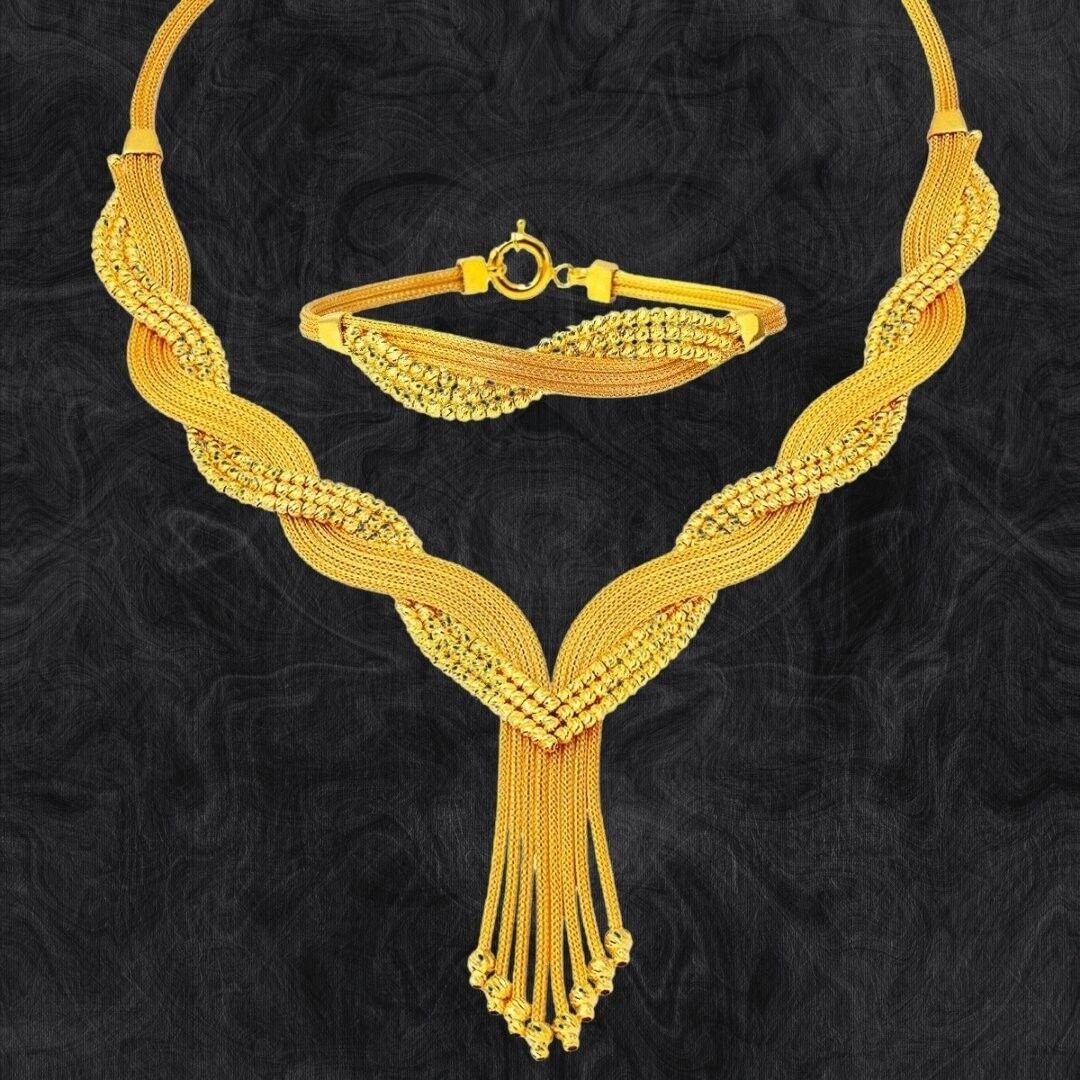 Evla Kuyumculuk’un 14 Ayar Altın Dolama Mesh Örgü Set Takımı 48,20 Gram modeli, modern ve zarif bir tasarıma sahip, her yaştan kadına hitap eden bir aksesuardır. Set takımı, mesh deseninin modern görünümünü altınla buluşturmaktadır.