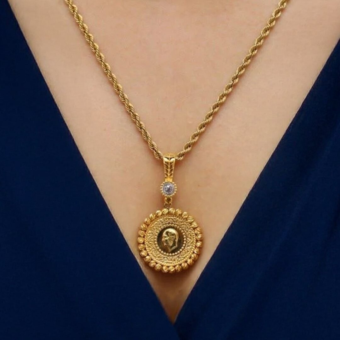 Üzerindeki çeyrek altın uygun fiyatlı gelmesi açısından baskı olarak üretilmiştir .14 ayar altındır .14 Ayar Altın Dorika Baskı Çeyrek Altın Kolye, zarif dorika baskı tekniği ile işlenmiş olup, çeyrek altın tasarımıyla sofistike bir görünüm sunar. Kolye, hem günlük kıyafetler hem de özel etkinliklerde kullanabileceğiniz modern ve şık bir aksesuardır. Kaliteli işçiliği ve dikkat çekici tasarımıyla, uzun yıllar boyunca tarzınızı tamamlar.