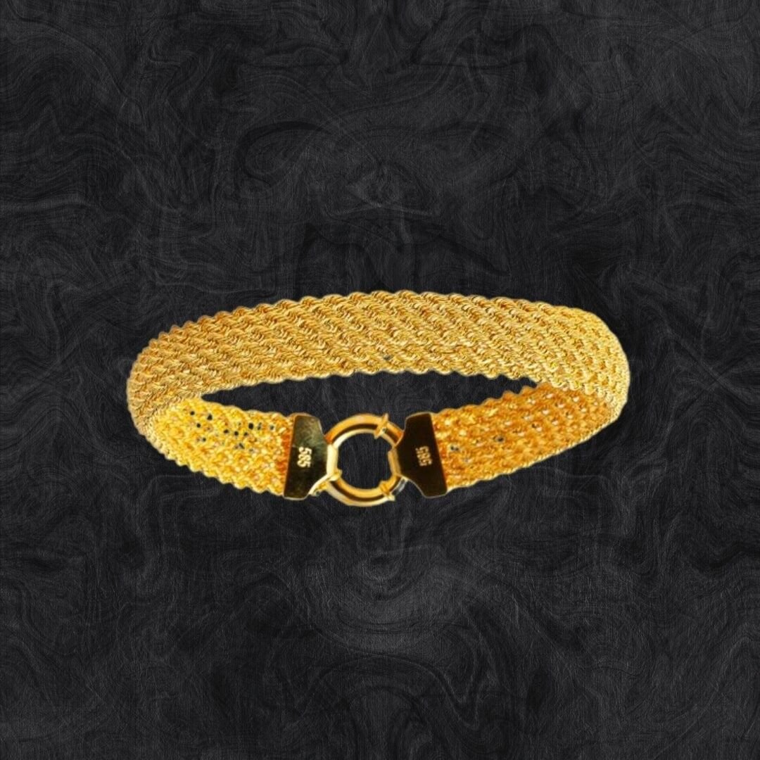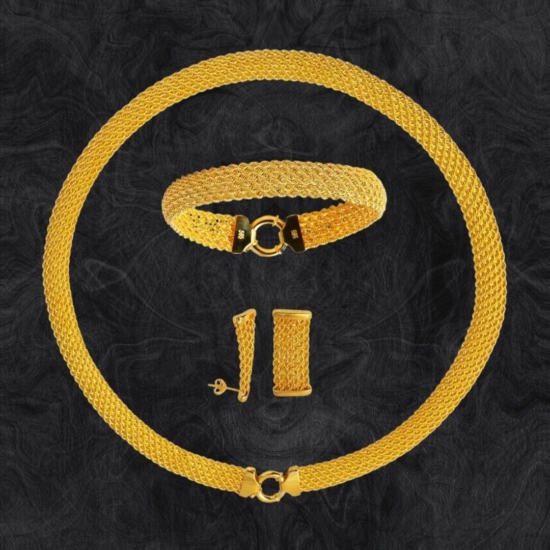 Evla Kuyumculuk’un 14 Ayar Altın Geniş Hasır Örgü Set Takımı 33,25 Gram modeli, modern ve zarif bir tasarıma sahip, her yaştan kadına hitap eden bir aksesuardır. Set takımı, hasır deseninin modern görünümünü altınla buluşturmaktadır.