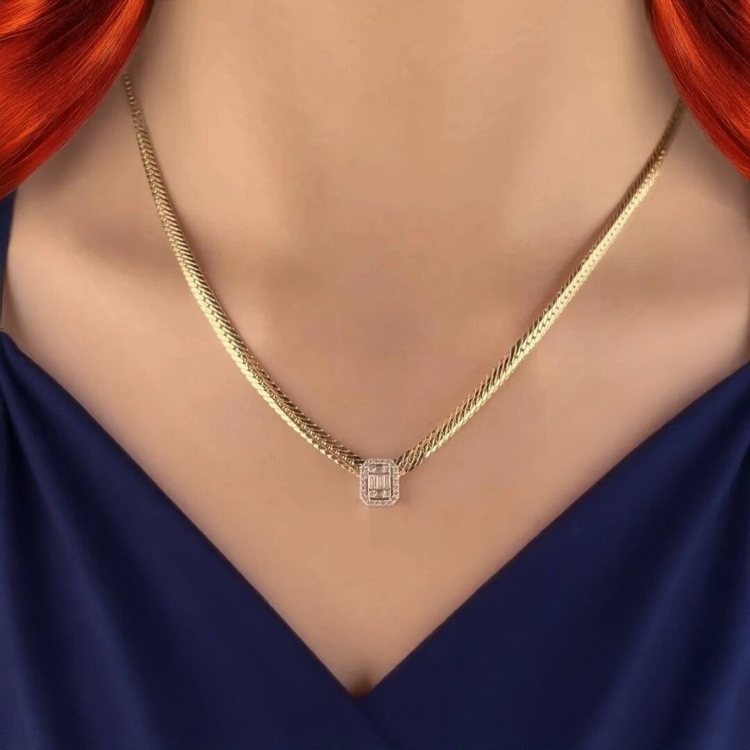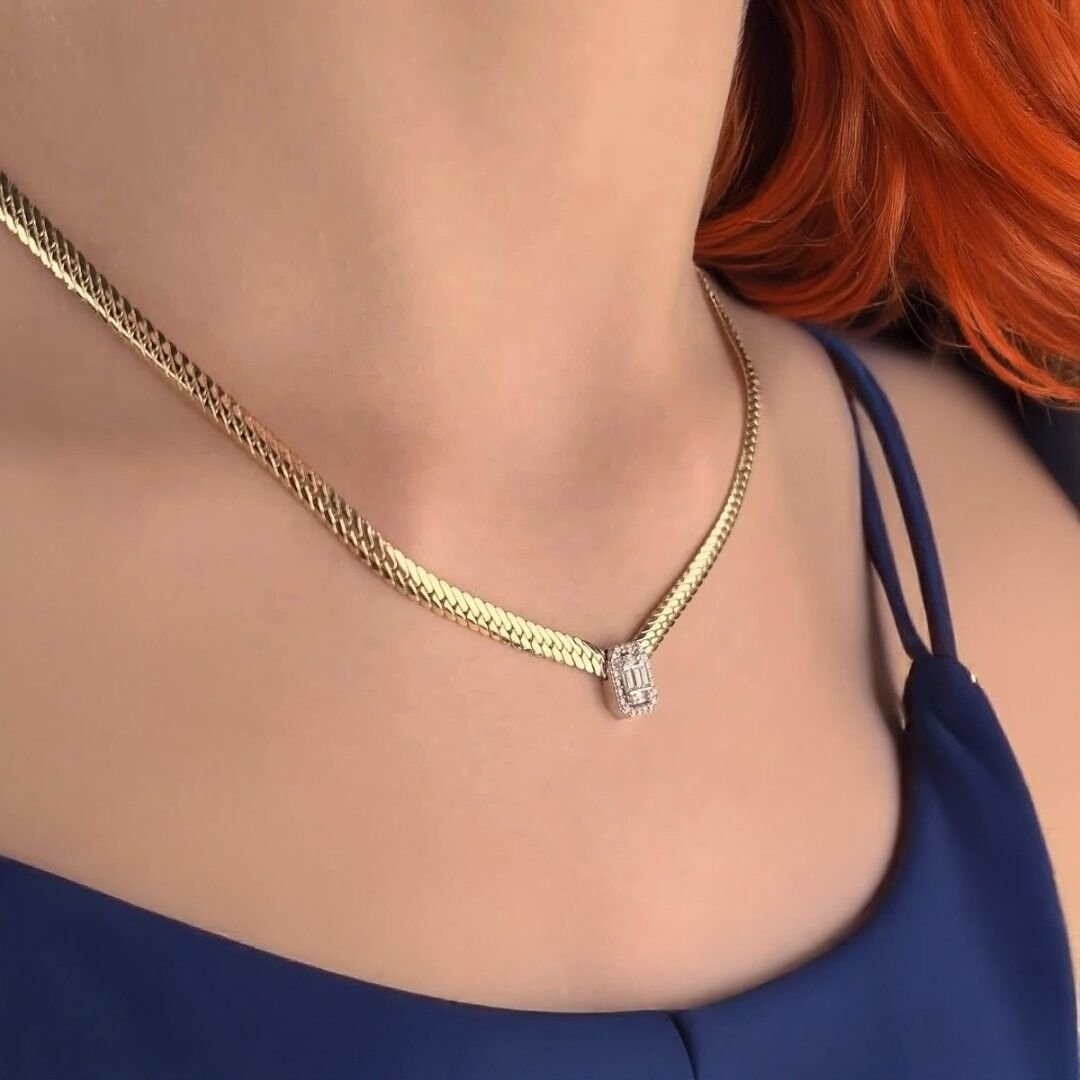 Bu 14 ayar altın İtalyan ezme bagetli zincir, modern ve zarif tasarımıyla günlük ve özel günlerde kullanabileceğiniz mükemmel bir aksesuardır. Parlak ve pürüzsüz yüzeyi, İtalyan ezme tekniği ile işlenmiş baget deseni ve hafif ve rahat yapısı ile dikkat çeken bu zincir, tarzınıza modern bir şıklık katacaktır.