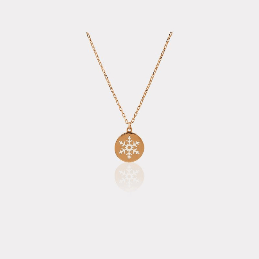 Altının parlaklığı ve dayanıklılığı ile dikkat çeken kolyenin merkezinde yer alan kar tanesi motifli altın plaka,