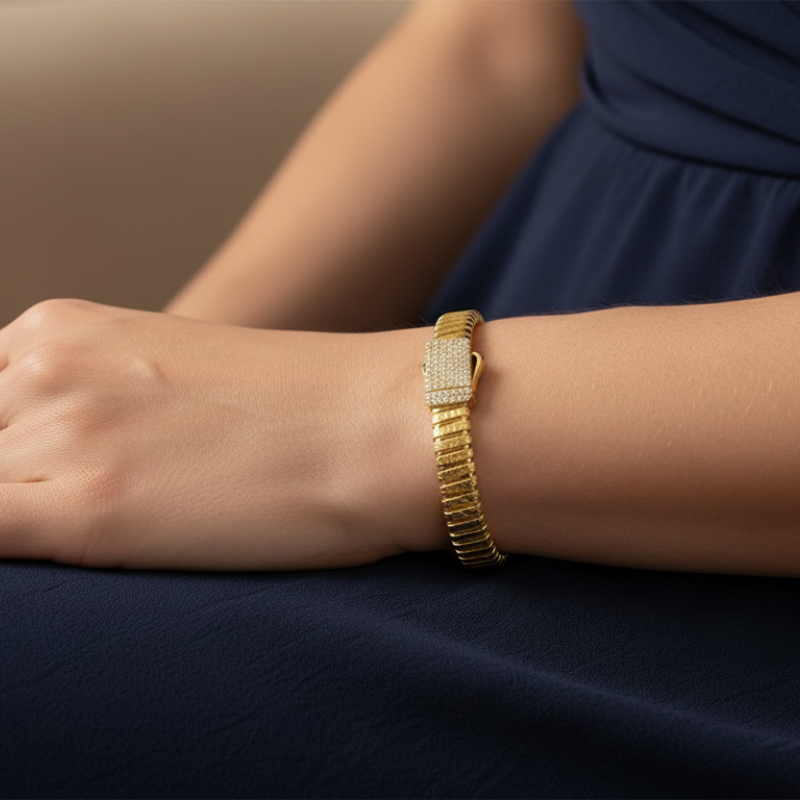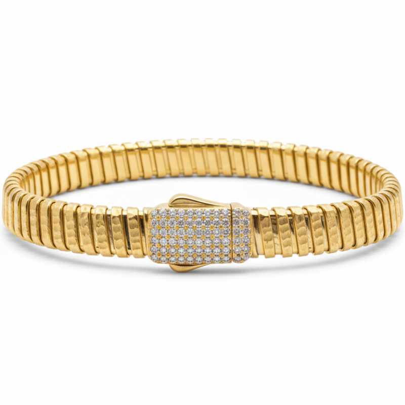 14 Ayar Altın Kelepçe Bilezik, İtalyan esnek yapısı ve estetik tasarımıyla zarif bir şıklık sunar. Kelepçe formu sayesinde bilekte modern ve tok bir duruş sergilerken, esnek yapısı kullanım kolaylığı ve konfor sağlar.