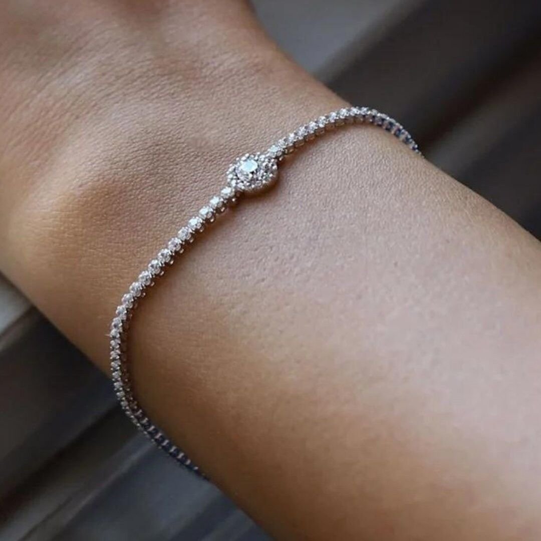 14 Ayar Altın Kronet Sıra Su Yolu Bileklik, 5,00 gram ağırlığında olup, beyaz altın tonlarında ışıltılı bir tasarıma sahiptir. Swarovski taşları ile bezeli Kronet Sıra Su Yolu tasarımı, bilekliğe zarif ve şık bir dokunuş katar. Klasik ve zarif bir stil sunan bu bileklik, her türlü şıklığınızı tamamlar.
