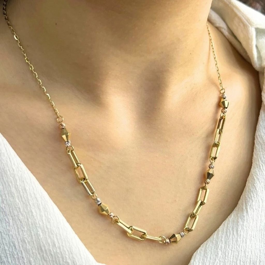 Bu 14 ayar altın set takımı, zarif ve modern bir görünüme sahiptir. Küp dorika formunun oluşturduğu tasarım, takımı şık ve gösterişli bir hale getirmektedir.