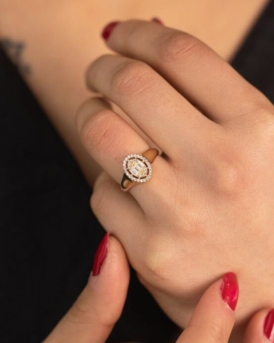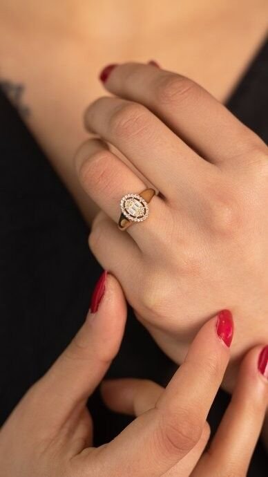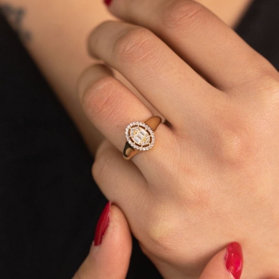 Yüzük, oval şekilli tasarımıyla öne çıkar ve altın baget kesim taşlarla zenginleştirilmiştir. Baget kesim taşların zarif hatları, yüzüğe modern bir dokunuş katarak ışıltılı bir görünüm sağlar. Bu zarif yüzük, parmağınızda göz alıcı bir vurgu yaparak tarzınızı ön plana çıkarır.
