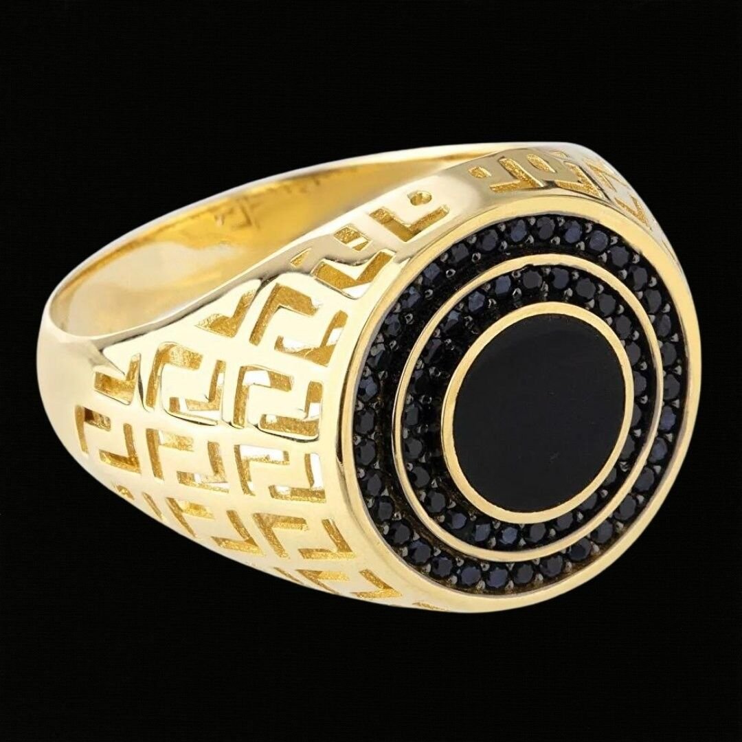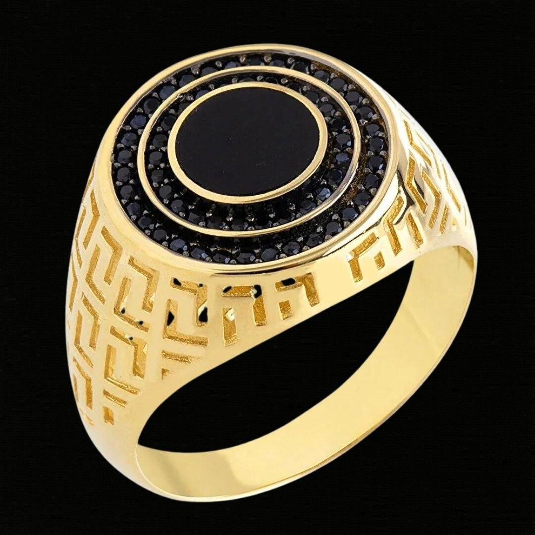 Yüzüğün ön yüzünde, oval şekilde kesilmiş pürüzsüz ve parlak bir siyah oniks taşı yer almaktadır. Siyah oniks taşı, yüzüğe klasik ve zarif bir görünüm kazandırmaktadır. Taşın etrafı, altın bir çerçeve ile çevrilidir. Bu çerçeve, taşa ekstra bir ışıltı ve değer katar. Yüzüğün yanları ve iç kısmı pürüzsüz bir şekilde cilalanmıştır. Bu da yüzüğü takmayı oldukça konforlu hale getirir.