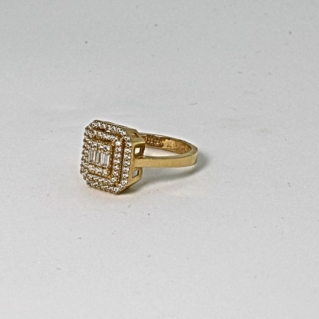 14 Ayar Altın Parçalı Baget Yüzük, 3,22 gram ağırlığında olup, sarı altının sıcak ışıltısını baget kesim taşlarla birleştirerek şık ve modern bir görünüm sunar. Baget kesim taş detayları, yüzüğe sofistike bir hava katarken, parçalı tasarım modern çizgileriyle stilinize farklı bir dokunuş ekler.