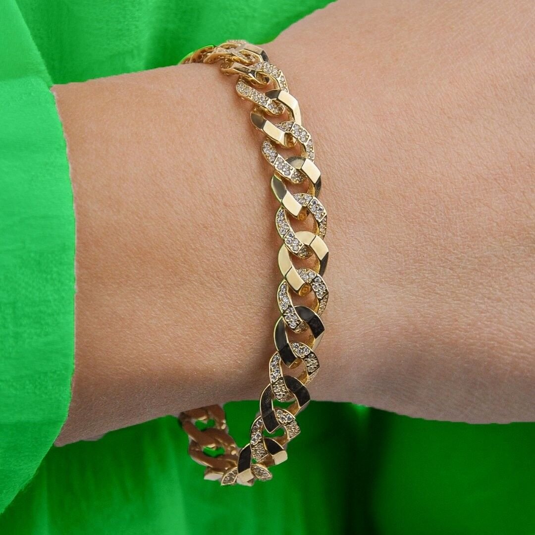 Yüksek kaliteli 14 ayar altın ile üretilmiş olan bu bileklik, zarif tasarımı ve ışıltılı taşlarıyla özel günlerde ve günlük kullanımda rahatlıkla kullanılabilir. 14 Ayar Altın Piramit Taşlı Monaco Bileklik ile stilinizi tamamlayın!
