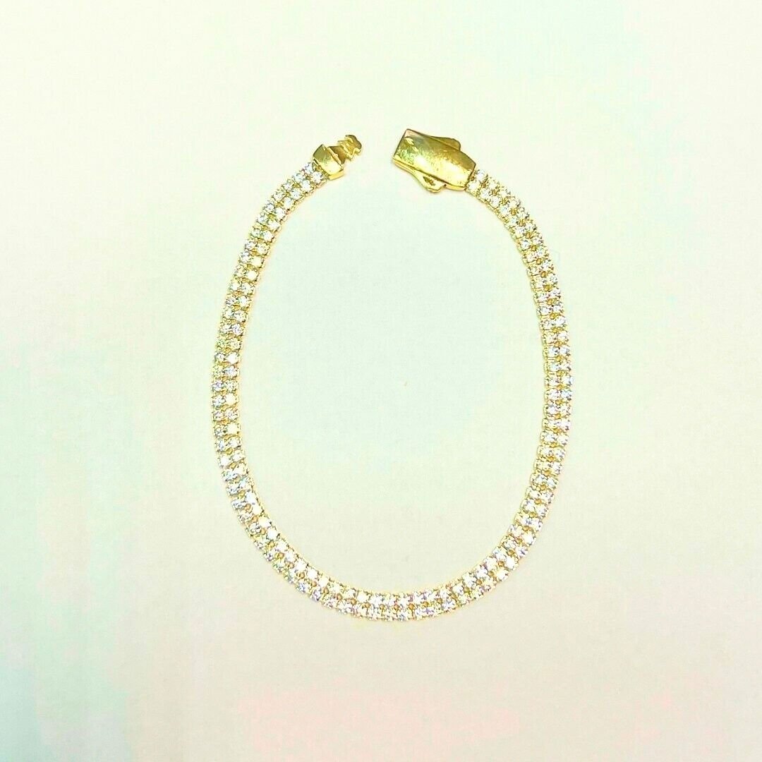 Bu zarif ve etkileyici 14 ayar altın çift sıra su yolu bileklik,Bileğinize şıklık ve ışıltı katacak modern bir tasarıma sahiptir. Su yolu bilekliklerin klasik dizaynına ek olarak, çift sıra taşlarla daha yoğun bir parlaklık ve lüks bir görünüm sağlar. Bu bileklik, her detayında zarafeti vurgular ve özel günler için mükemmel bir seçimdir.