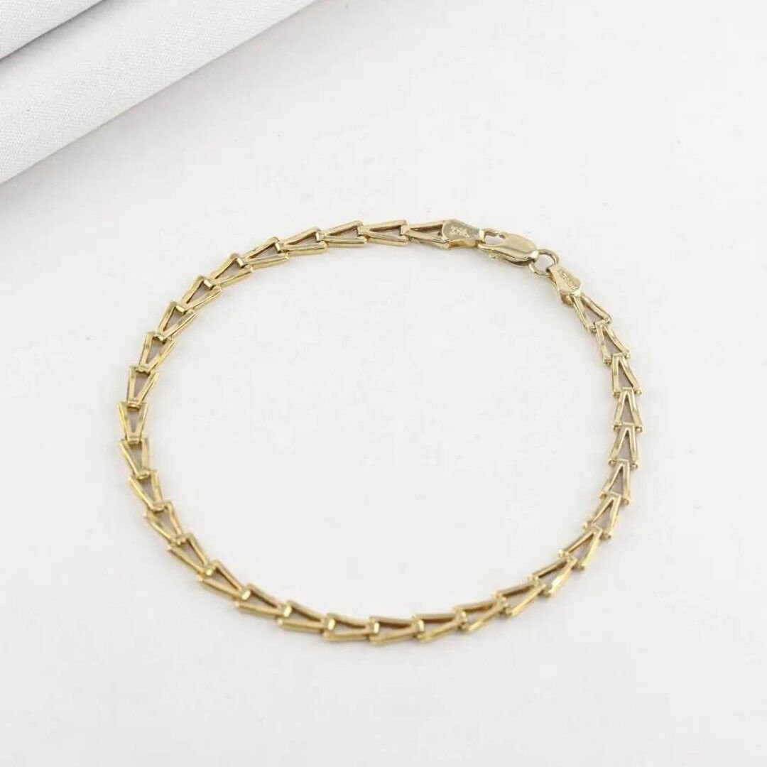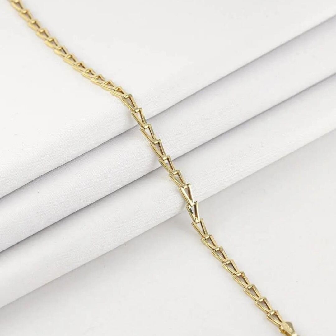 Özgün tasarımıyla dikkat çeken 14 Ayar Altın Üçgen Zincir Bileklik , modern ve zarif detaylarla stilinizi tamamlıyor. 3,85 gramlıkve sarı altın renginde üretilen bu özel bilehem özel davetlereÜretilen bu özel bileklik, hem günlük kullanıma hem de özel davetlere uyum sağlayacak şekilde tasarlanmıştır.