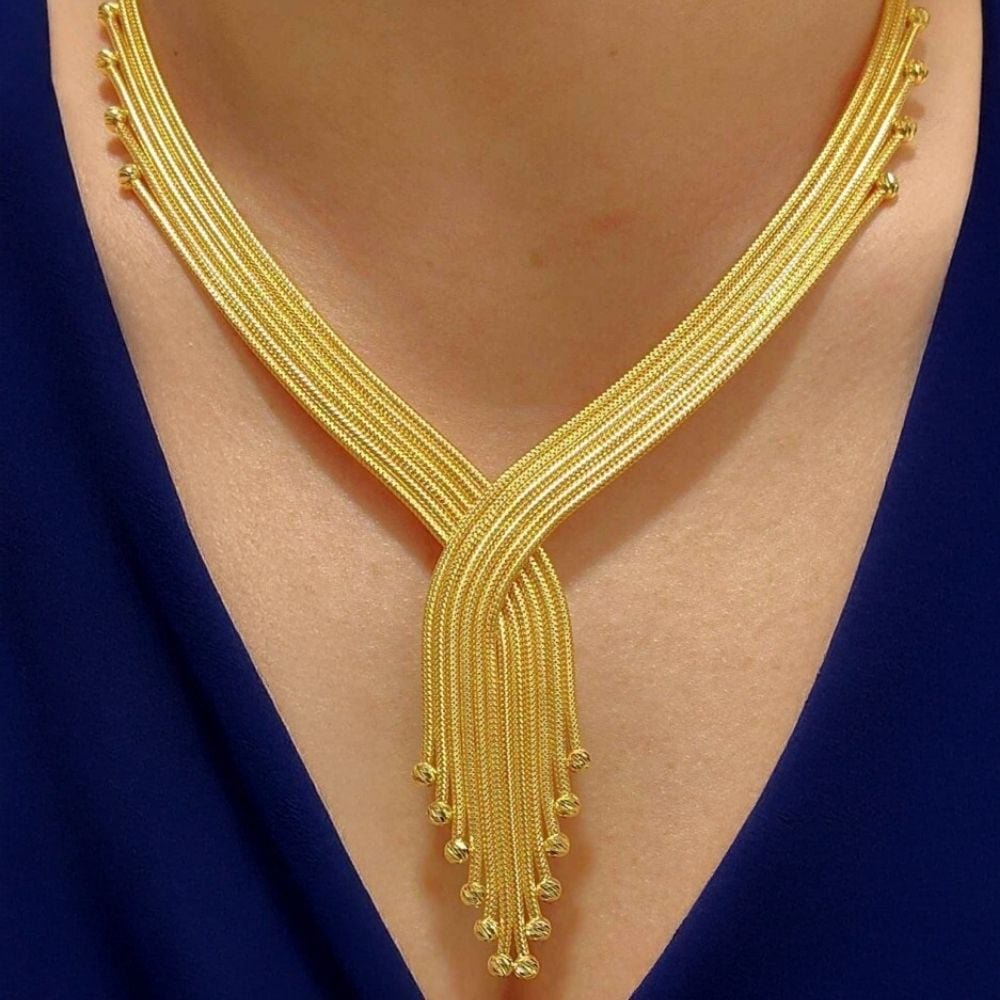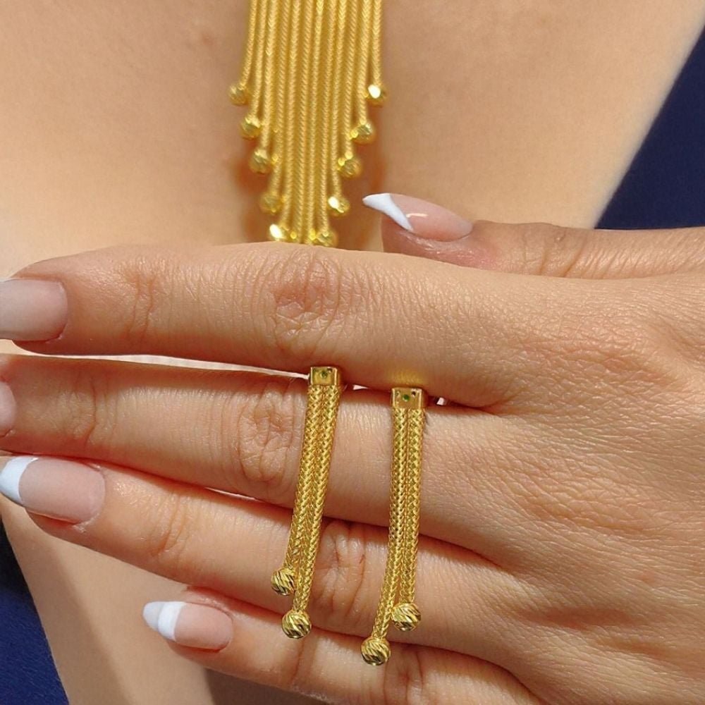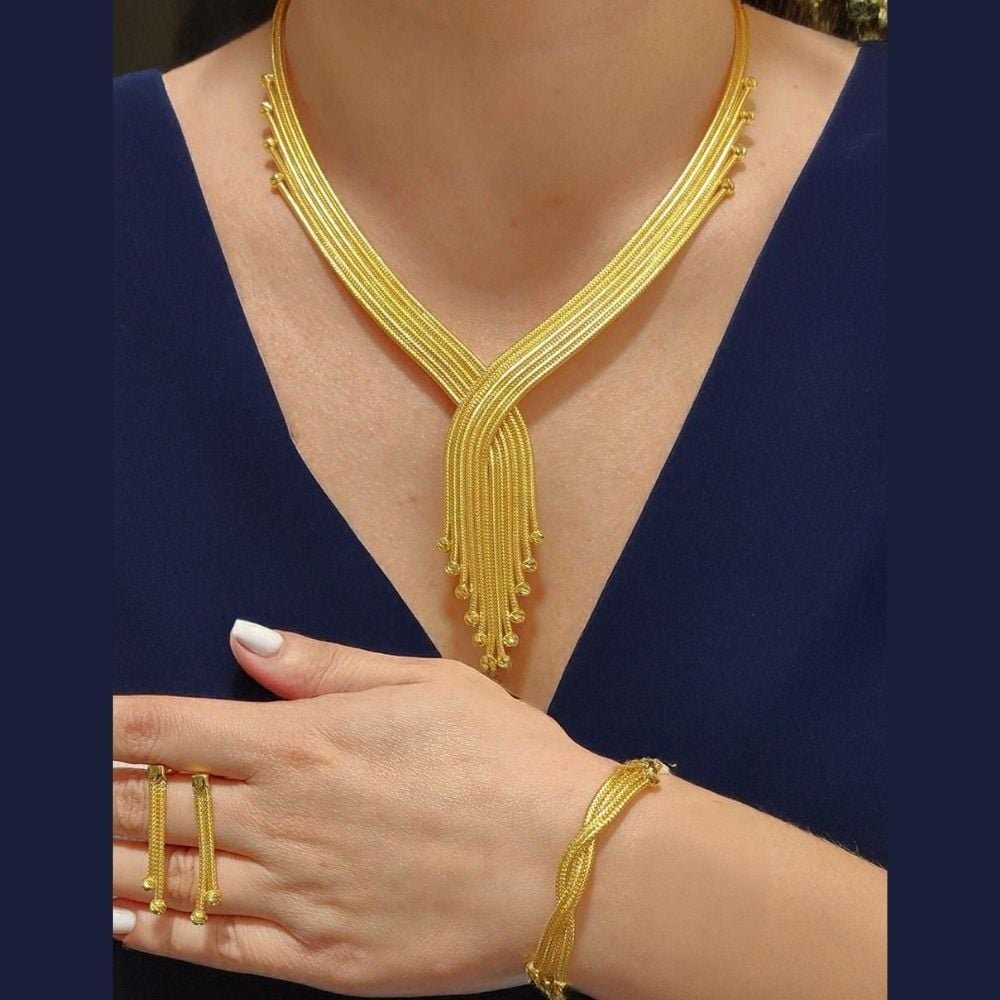 Örgü hasır dokuma tekniğiyle tasarlanmış bu altın set, hem geleneksel Türk kuyumculuğunun izlerini taşır hem de modern çizgileriyle günlük ve özel gün kullanımlarına uygundur. 8 ayar kalze set takımı, hafif yapısı ve parlak sarı altın tonu sayesinde hem konfor hem de gösteriş arayanlar için mükemmel bir tercihtir.