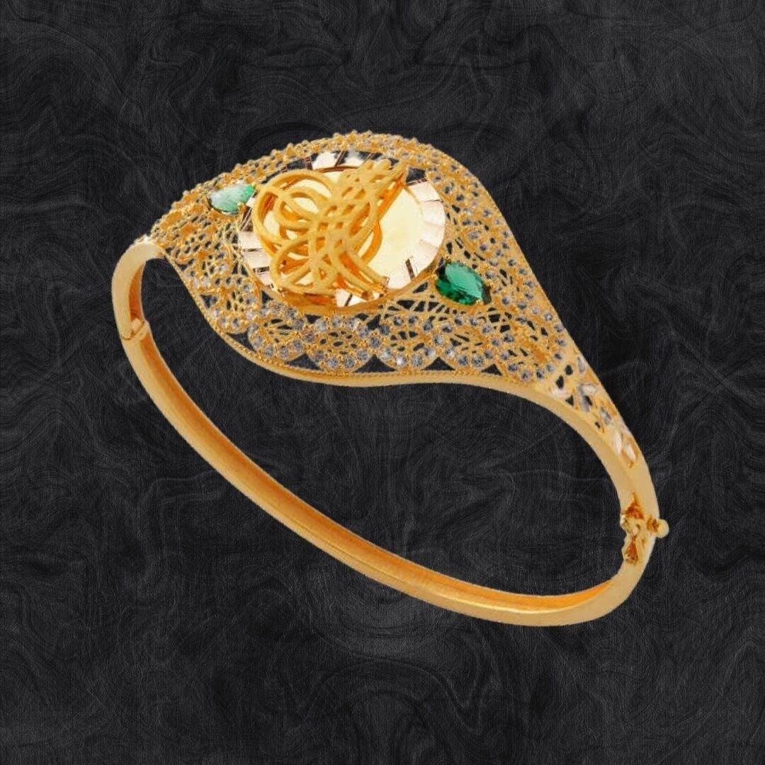 Bu 8 AyarAltın Tuğralı Kelepçe, Evla Kuyumculuk tarafından özenle tasarlanmıştır . Birmücevherat ürünüdür. Yüksek kaliteli malzemeler kullanılarak yapılmış ve özgüntasarımıyla dikkat çekmektedir. Bu kelepçe, 8 ayar altın kullanılaraküretilmiştir ve toplamda 12,15 gram ağırlığındadır. Üzerindeki tuğra detayları,Osmanlı İmparatorluğu’nun sembolik bir ifadesini taşır ve kelepçeye tarihi birruh katmaktadır. Altın rengi, şıklığı ve zarafeti yansıtan bir görünüm sunar.Kelepçe şeklindeki tasarımı modern ve zarif bir görünüm sunar.