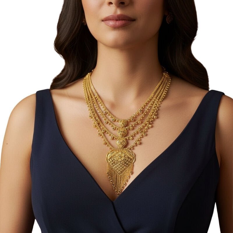 Hint motiflerinden ilham alan tasarımıyla öne çıkan bu set kolye, klasik takı anlayışını sevenler için hem estetik hem de değerli bir tercihtir. Altın hint kolye modelleri arasında fark yaratan 4 sıralı yapısı, şıklığı tek parçada toplar.