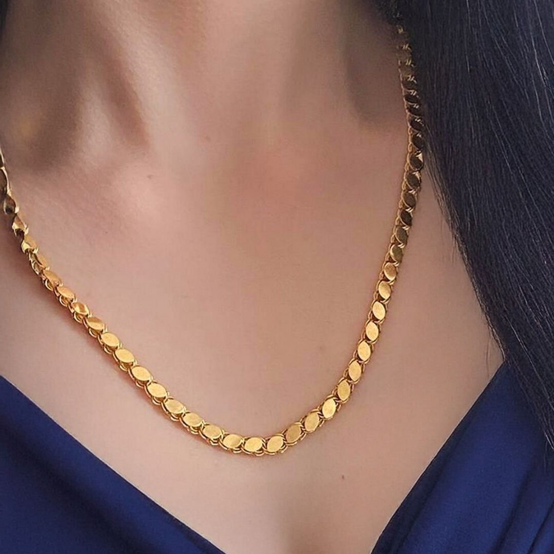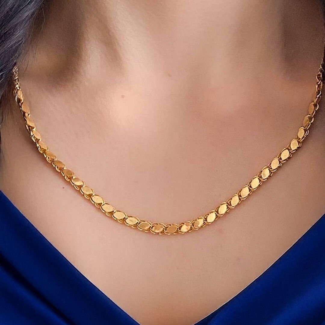 Işıltısıyla göz kamaştıran bu özel Altın Pullu Zincir,  55 cm uzunluğu ve 4 mm genişliği ile evla kuyumculuk güvencesi ile sizlere en uygun fiyat sunmak amacıyla altın zincir olarak tasarlandı. 22 ayar altın renginde parlak görünümü sayesinde daha değerli ve dikkat çekici bir duruş sunar.