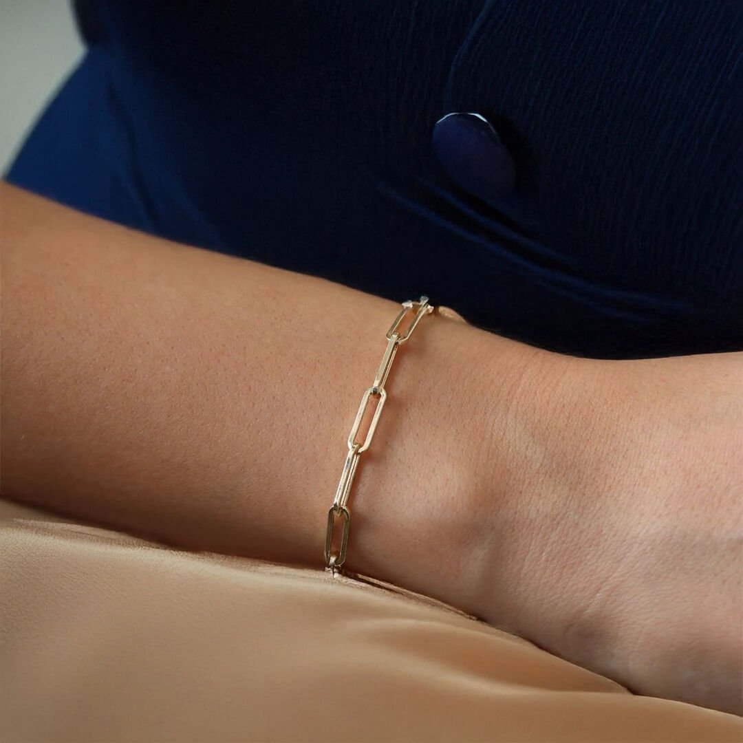 Ataç formundaki halkalarla tasarlanmış bu altın bileklik, hem tek başına hem de diğer bilekliklerle kombinlenmeye uygundur. Hafif yapısıyla günlük kullanım için idealdir, zarafetiyle özel günlerde de öne çıkar.