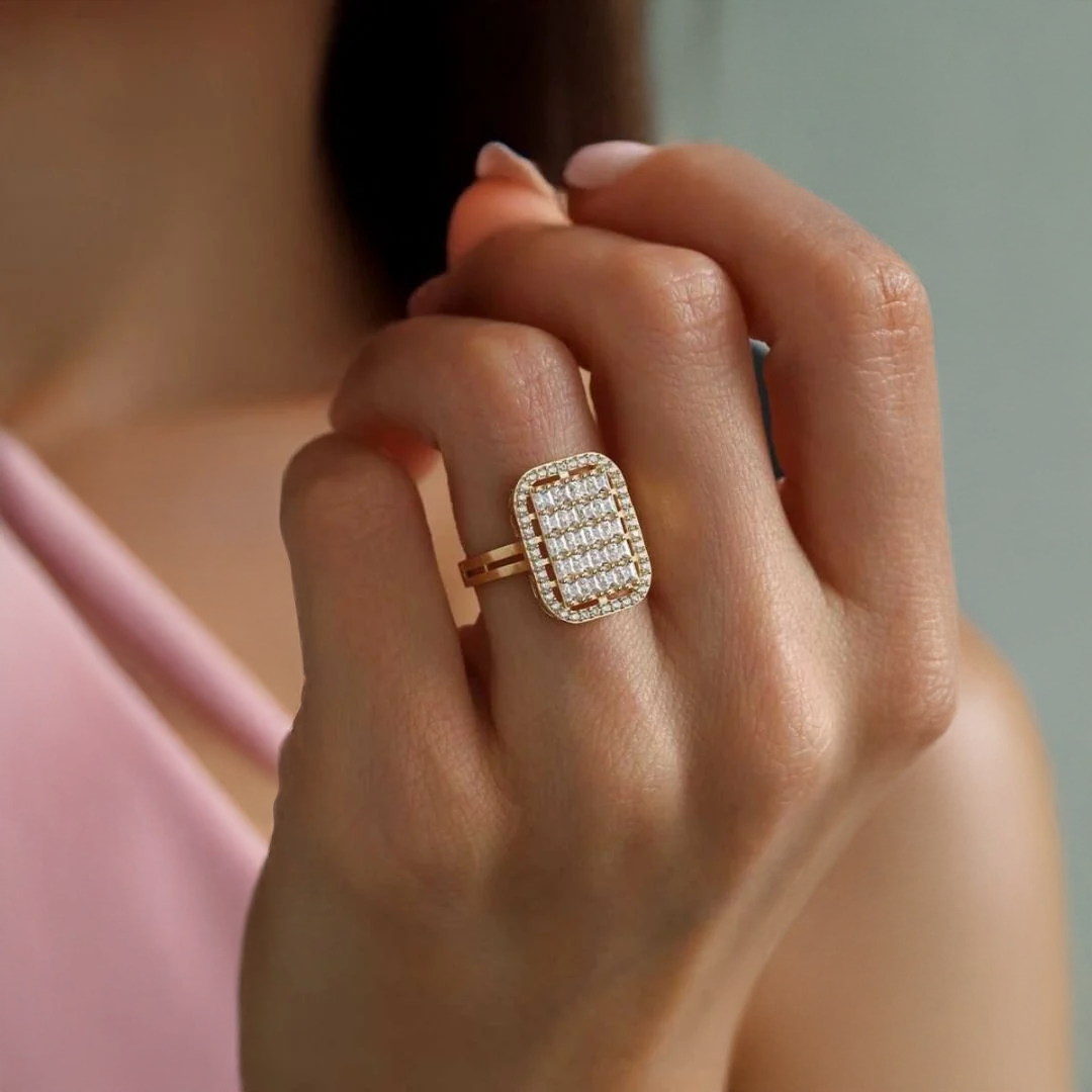 Sarı altının sıcak tonlarıyla birleşen bu gösterişli tasarım; günlük kullanımda iddialı bir dokunuş, özel günlerde ise tamamlayıcı bir şıklık sağlar. Hem tek başına hem de diğer baget yüzüklerle kombin yapmaya uygundur.