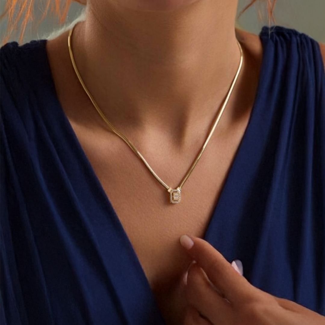 Bu özel tasarım 8 ayar altın balık sırtı zincir kolye, dikkat çekici baget taş detaylarıyla tamamlanmıştır.