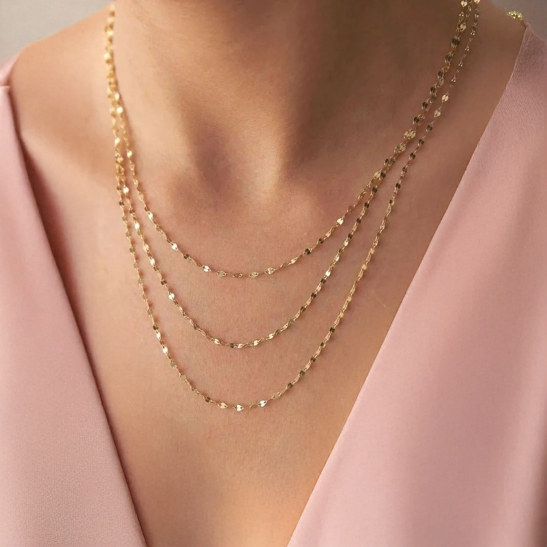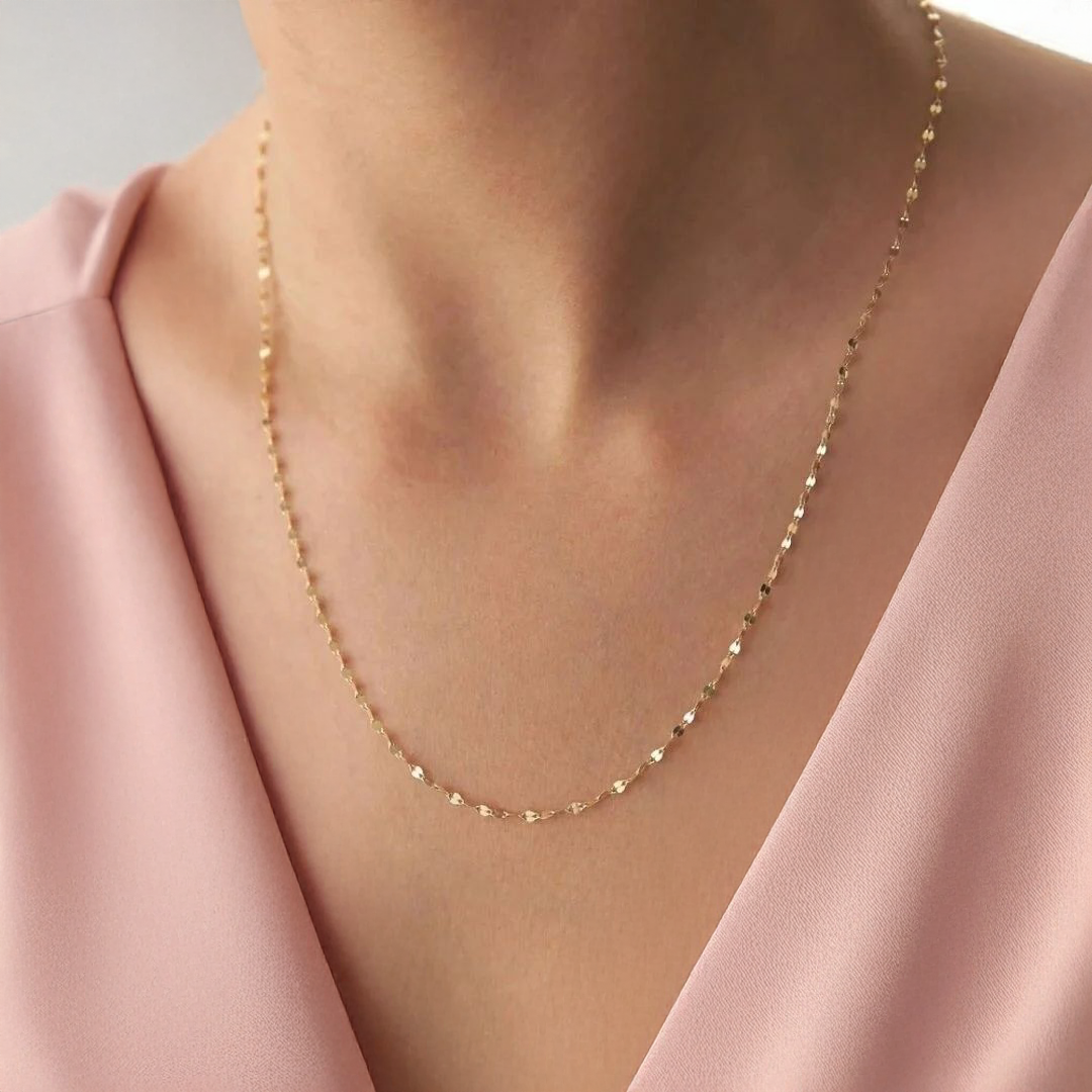 14 Ayar Altın İnce Ayna Zincir, minimal ama göz alıcı bir tasarıma sahiptir.