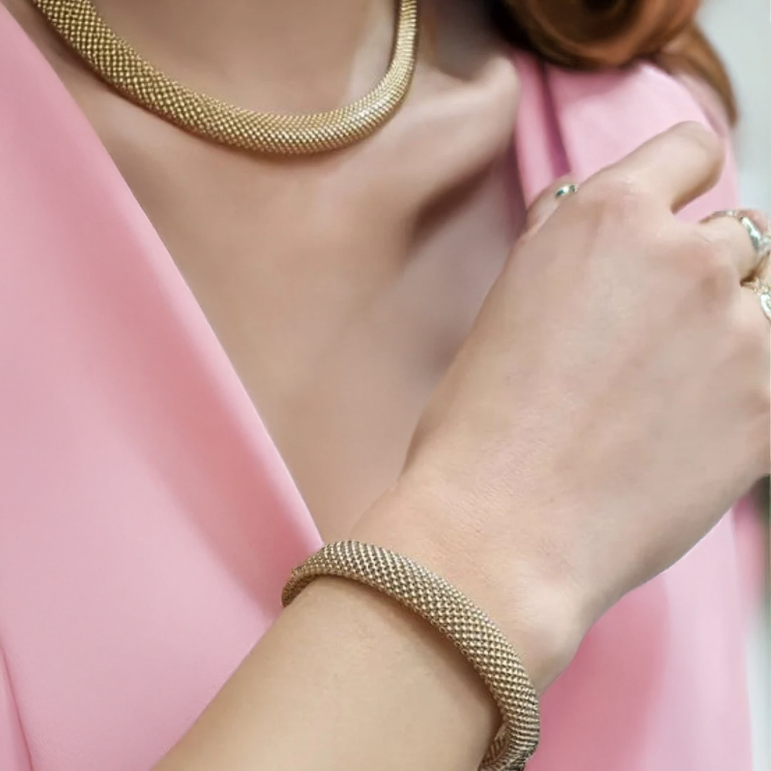 Zarafet, asalet ve modern dokuyu bir araya getiren Altın Jessica Set Takımı, 14 ayar altının ışıltısını benzersiz bir tasarımla sunar.