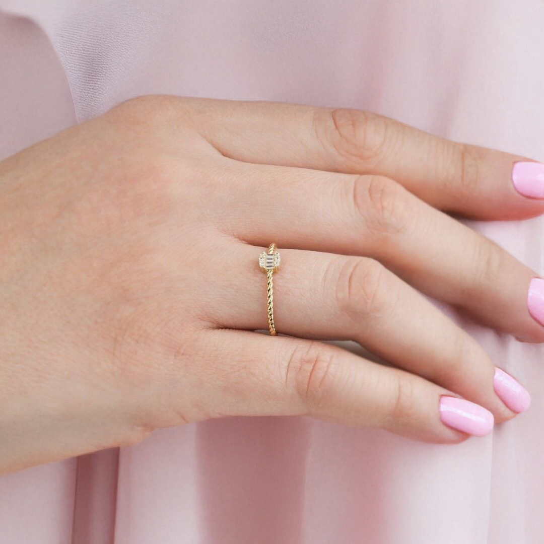 14 ayar altın yapısı, yüzüğün hem dayanıklı hem de uzun ömürlü olmasını sağlar. Usta işçiliğiyle montelenmiş mini baget taş, ışığı keskin hatlarıyla yansıtarak yüzüğe göz alıcı bir ışıltı kazandırır. Minimal tasarım arayan, ince yapılı altın yüzük tercih eden kadınlar için ideal bir modeldir.