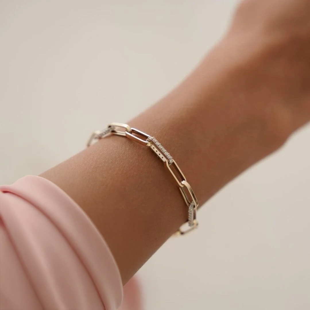 14 Ayar Altın Taşlı Ataç Bileklik, modern ataç halkalarının üzerine yerleştirilen ışıltılı taş detayları sayesinde hem zarif hem de güçlü bir stil sunar. Ataç formunun net ve modern çizgileri, taşların parlaklığıyla birleşerek bileklikte son derece şık bir duruş oluşturur.