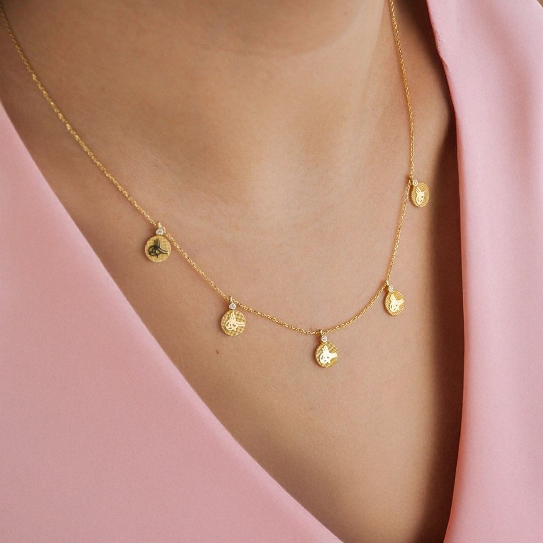 14 ayar sarı altından üretilen Beşli Tuğra Kolye, geleneksel tuğra motifini zarif bir formda sevenler için ideal bir seçenektir.