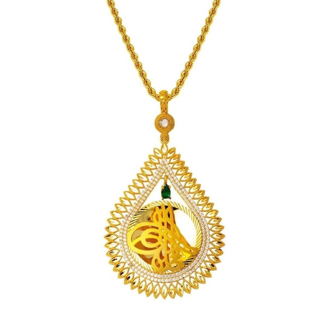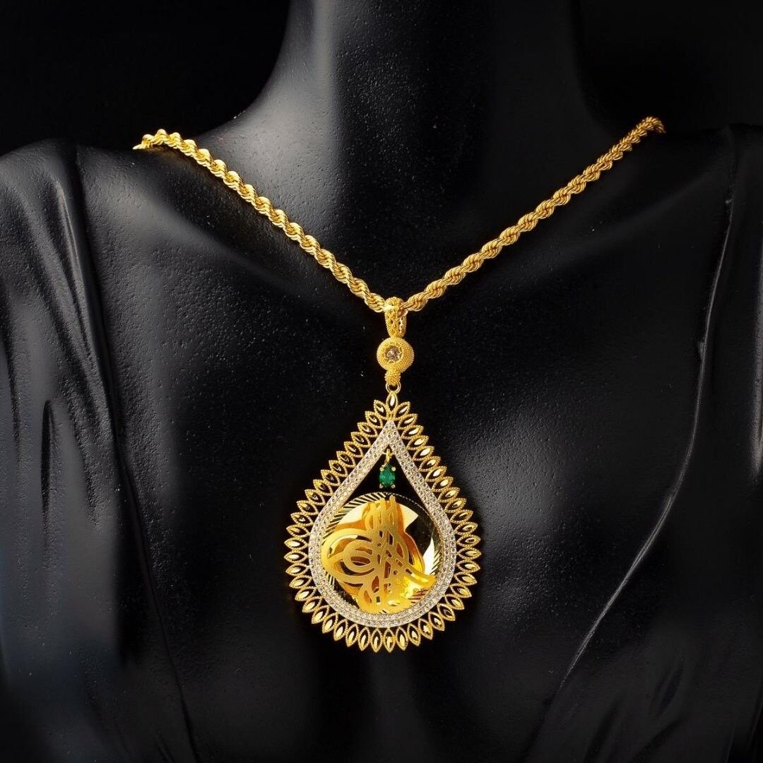 Damla Tuğralı 8 Ayar Altın Kolye 14,30 Gram: Evla Kuyumculuk, tarihi bir sembol olan Tuğra’nın zarafetiyle harmanlanan Damla Tuğralı 8 Ayar Altın Kolye’yi sizlere sunmaktan gurur duyar. Bu özel tasarım kolye, estetik bir görünüm ve sembolik bir anlamı bir araya getirerek dikkatleri üzerinize çeker. 14,30 gram ağırlığındaki bu tuğralı altın kolye, yüksek kaliteli 8 ayar altın ile özenle işlenmiştir. Damla şeklindeki tasarımı, kolyeye zarif bir dokunuş katar ve Tuğra’yı merkeze yerleştirir. Tuğra, Osmanlı İmparatorluğu’nun resmi sembolüdür ve güç, otorite ve tarihi bir mirası temsil eder.