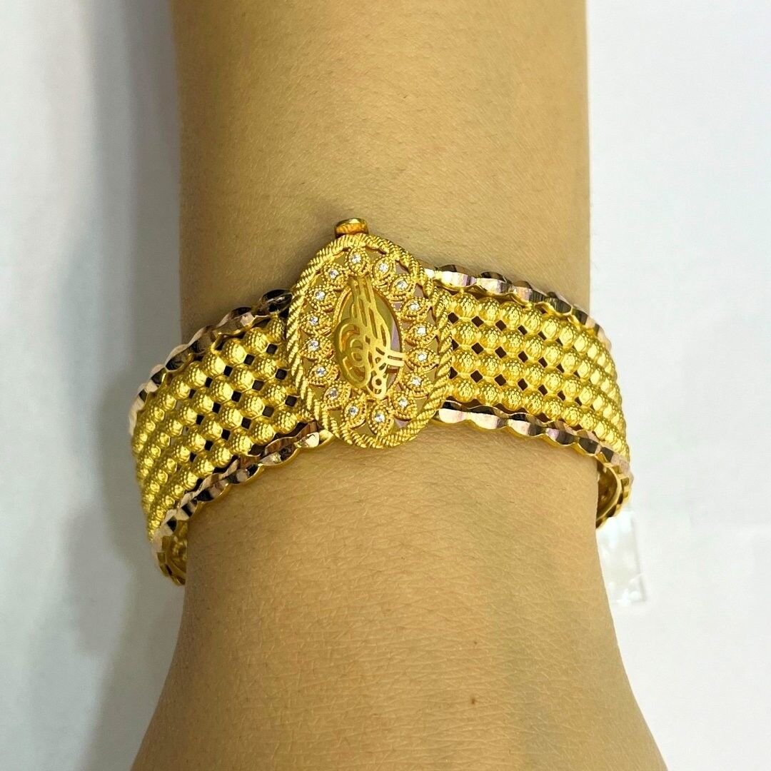 Bu 8 ayar sarı altın tuğralı fantezi kelepçe, klasik ve zarif bir tasarıma sahiptir. Tuğra motifi, bilekliğe geleneksel bir hava katarak, her ortamda dikkat çekici bir aksesuar sunar.
